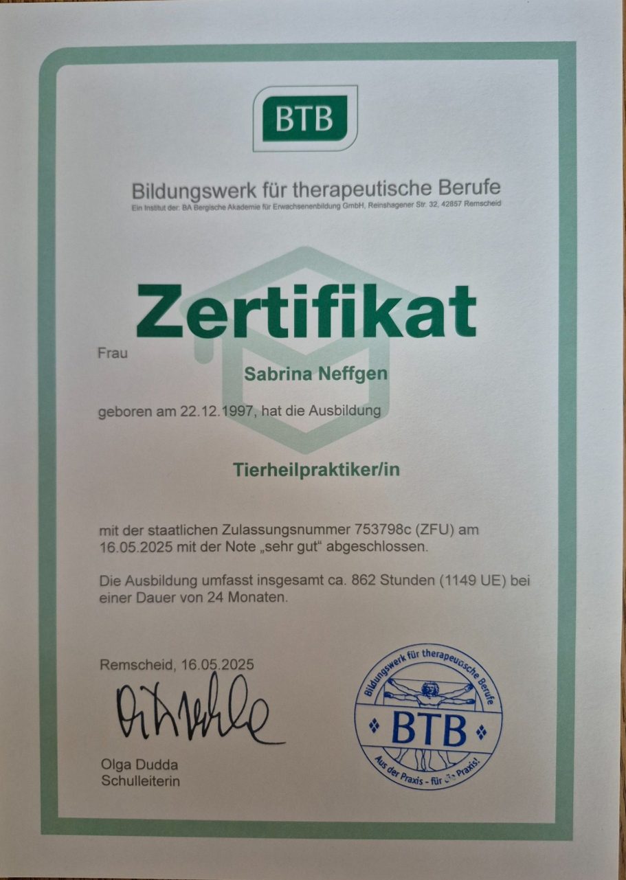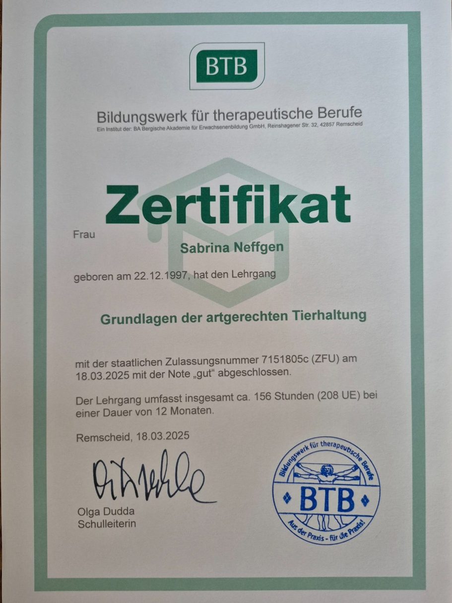 Mein Name ist Sabrina Neffgen und ich bin ausgebildete Tierheilpraktikerin. Meine Ausbildung mit dem zusätzlichen Schwerpunkt Verhaltenstherapie für Kleintiere habe ich letztes Jahr bei der BTB erfolgreich abgeschlossen.